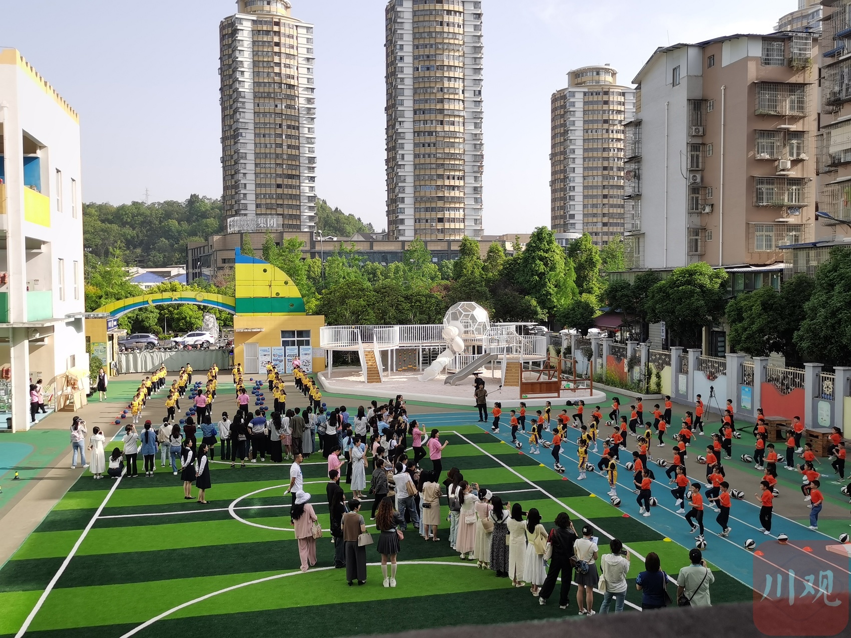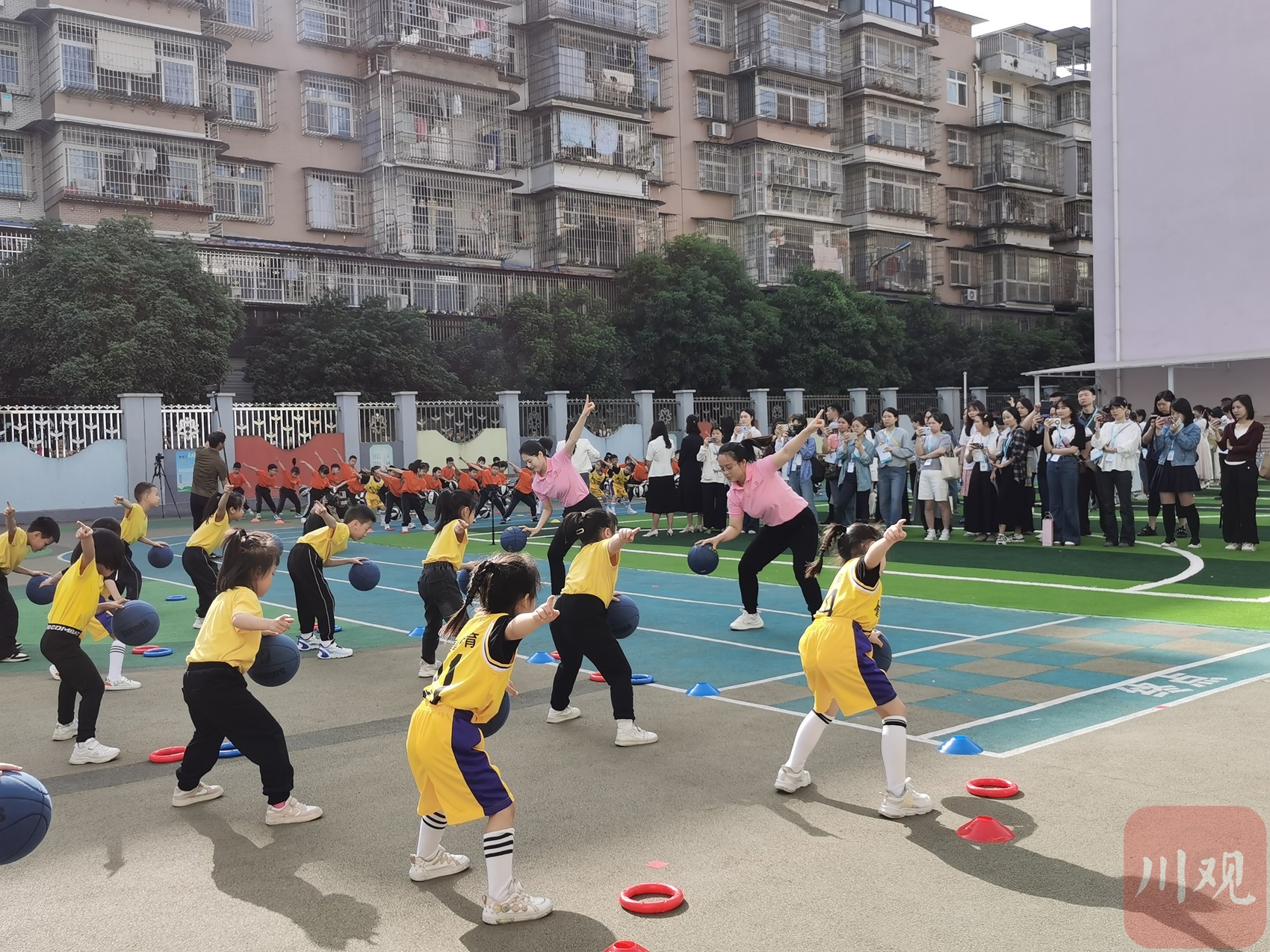当天,一场“以体育智、以体育心”的展示活动拉开帷幕。跑道上绘制的图形、线条,成为幼儿晨间活动趣味满满的地面游戏,平衡木、跳箱、障碍柱等器材间隔摆放,变成了孩子们尖叫欢笑的“探险乐园”。孩子们在“户外体能大循环”中展现了灵动与坚韧,在“星际风暴”篮球操中彰显出协作与活力,在体操展演中传递着自信与风采,观摩人员纷纷举起手机,记录下孩子们跳跃的身影、昂扬的风采,也将独具资阳特色的幼儿健康活动带回自己的学校,各自取长补短,提升园所质量。