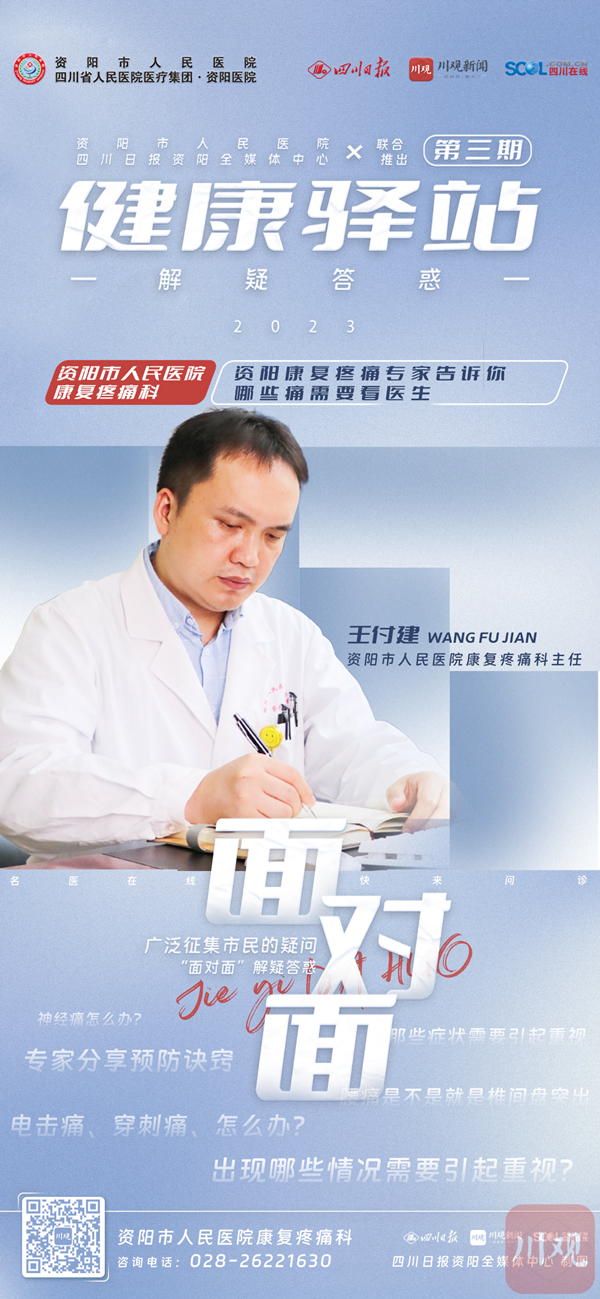 10月22日,《健康驿站》第三期邀请到资阳市人民医院康复疼痛科主任王付建,向网友征集大家关心的问题。不到一周的时间,就征集到了43个问题,涉及疼痛的辨别、如何运动康复等方面。针对这些疑问,资阳市人民医院康复疼痛科团队进行一一解答。