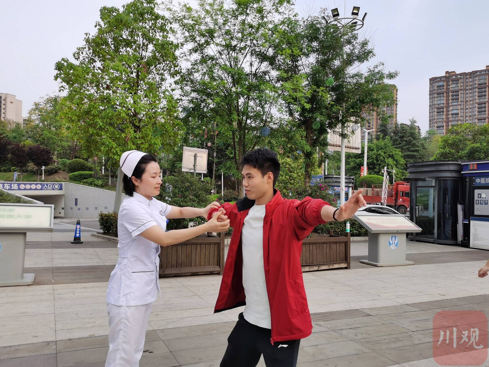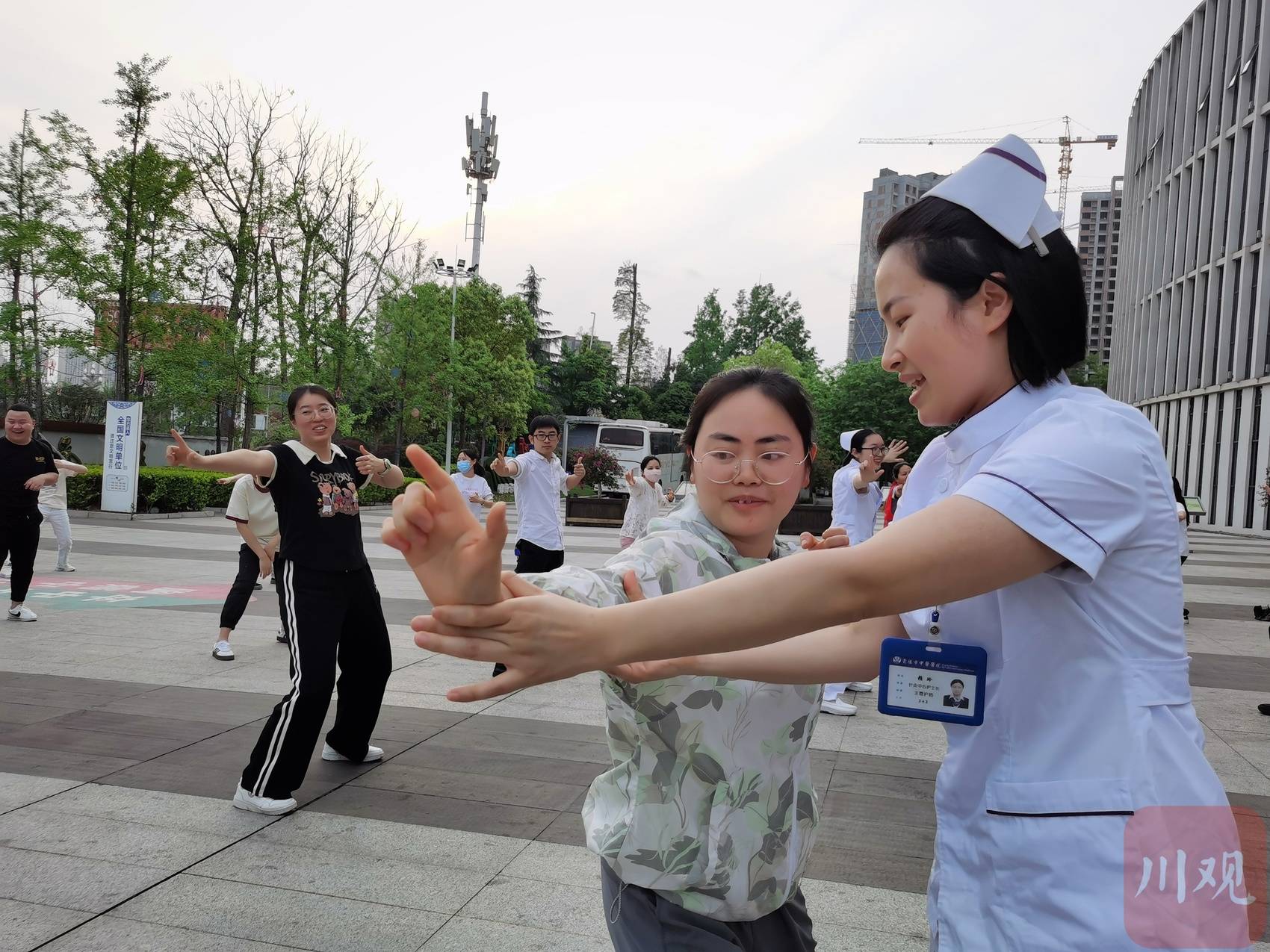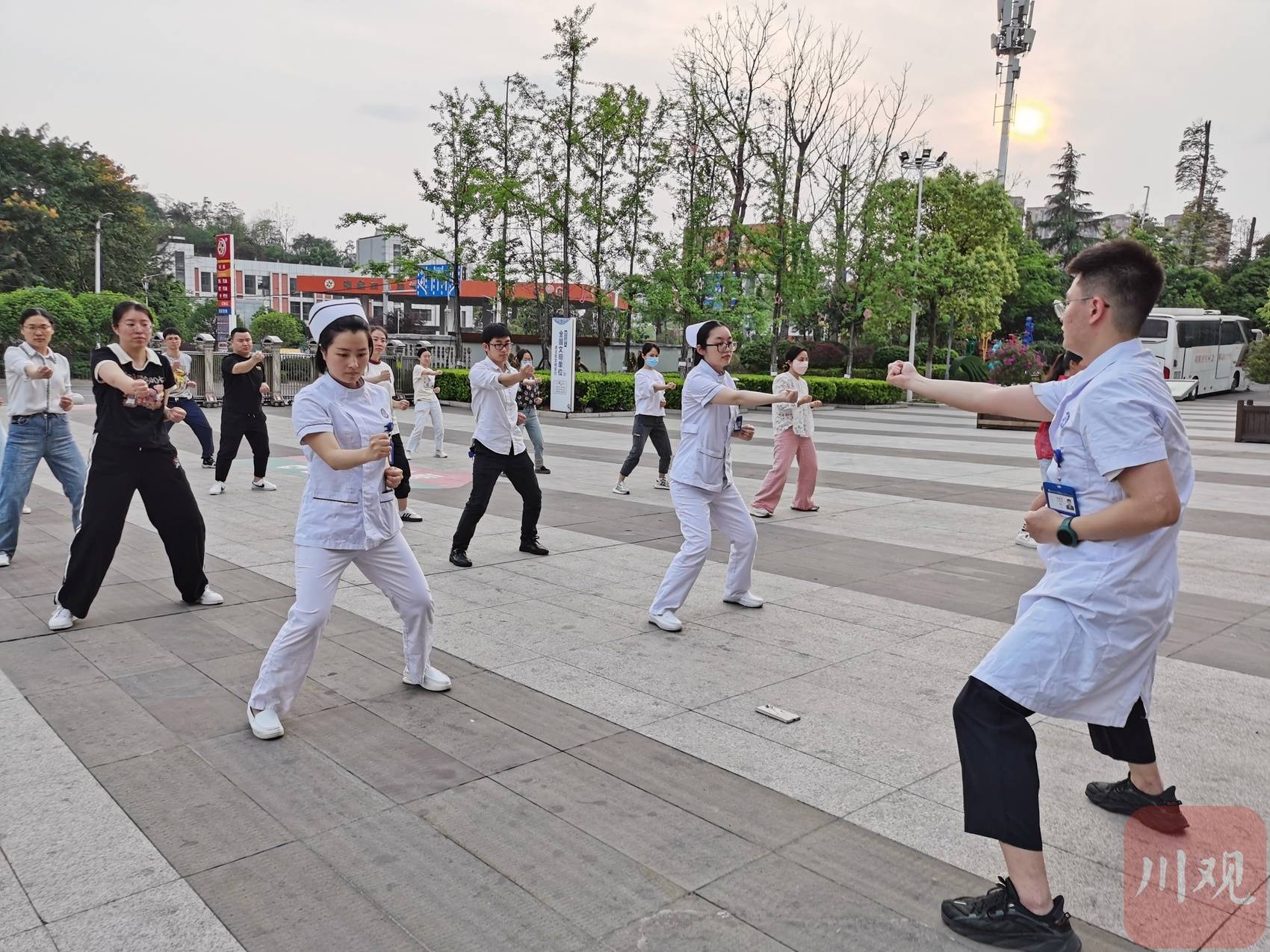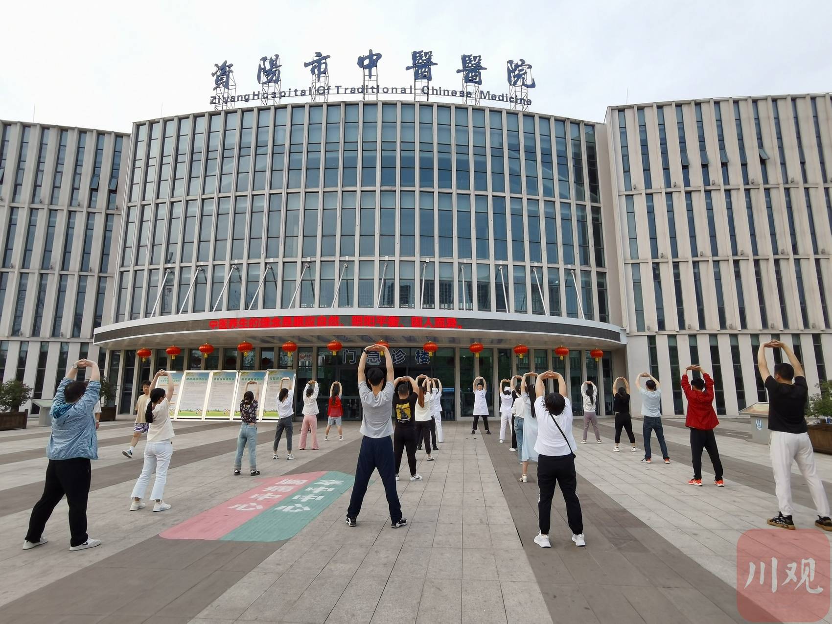 “微微屈膝,向左跨一步,双手从身体两侧往外拉……”4月17日下午6点,资阳市中医医院门诊大楼内逐渐安静,大楼外的广场却热闹起来,针灸中心的医务人员正在开展八段锦锻教学。