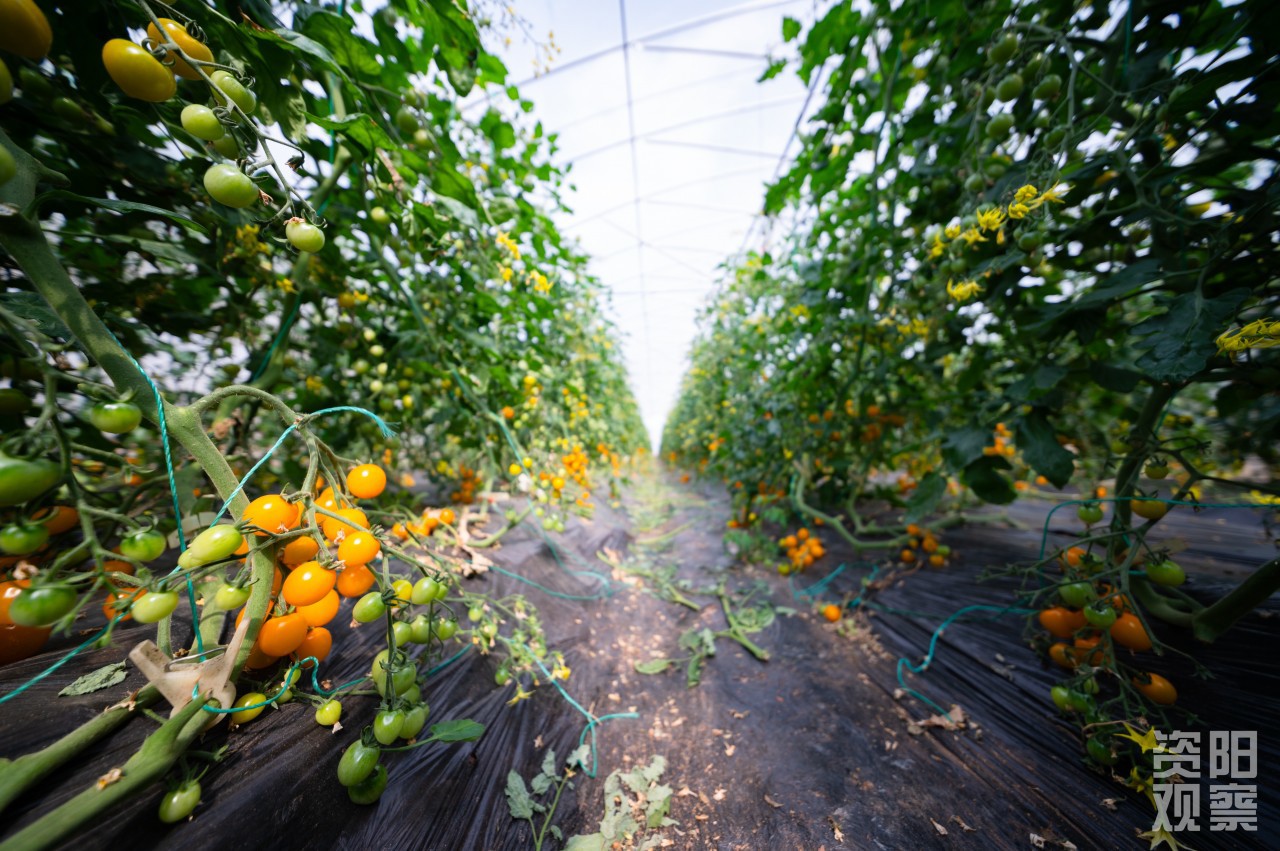 一排排绿色的藤蔓上,一串串成熟或半成熟的小番茄,在青翠欲滴的枝叶映衬下格外诱人……