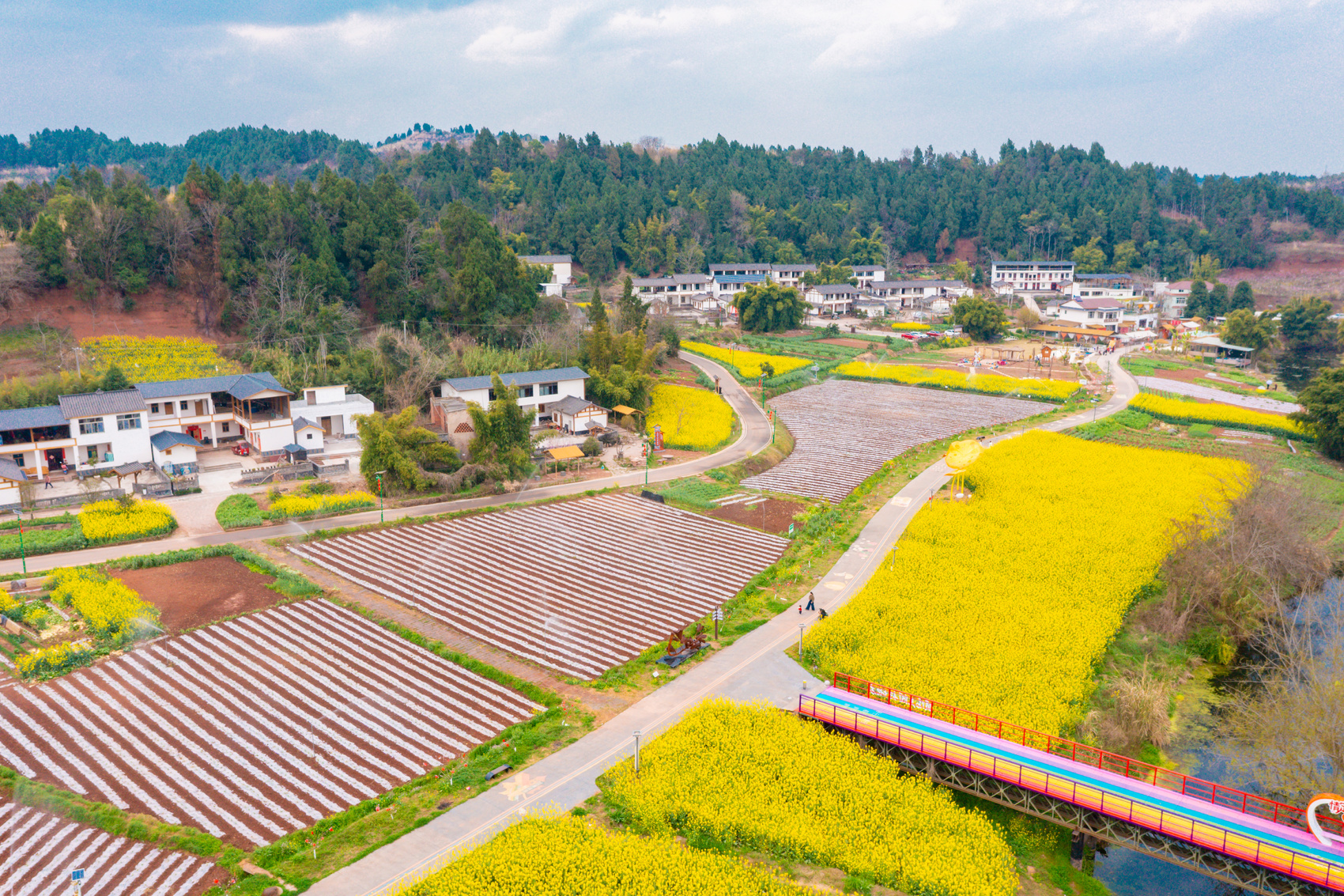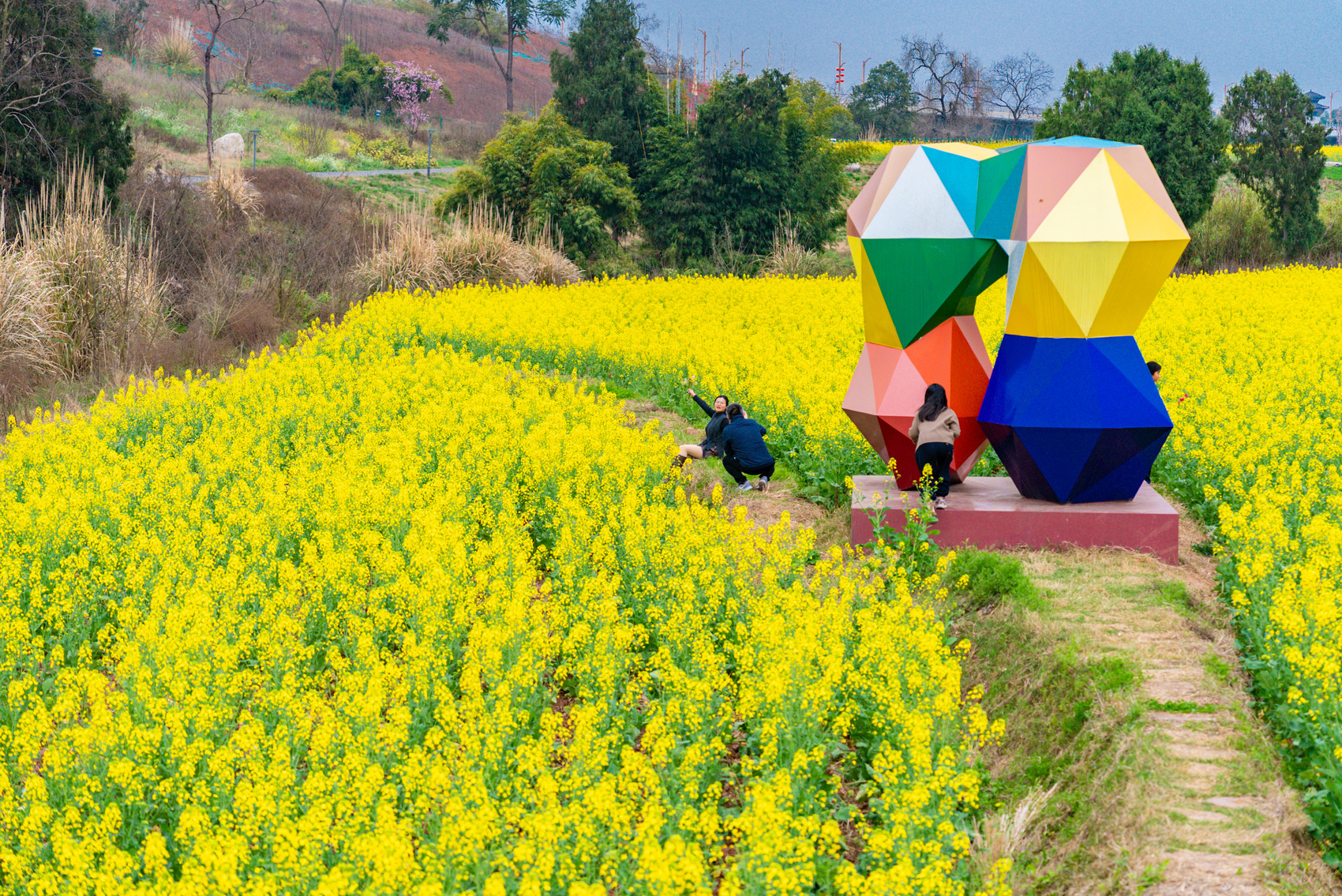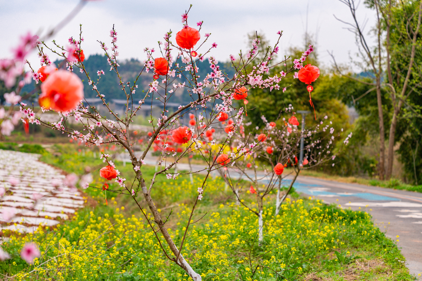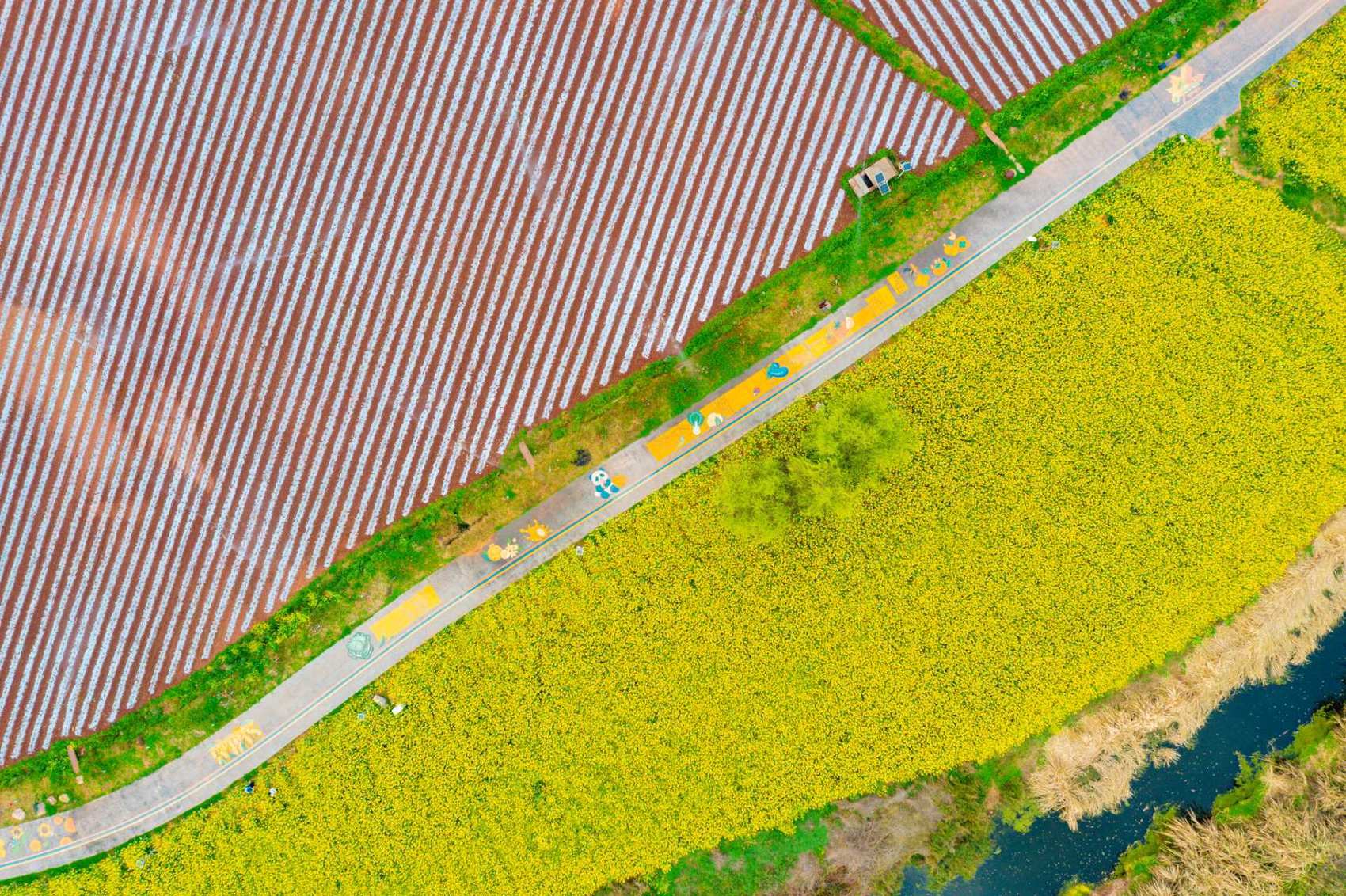 春风送暖,资阳临空经济区红碑村繁花竞放,绘就诗意田园画卷。村内梅花清雅、樱花烂漫、油菜花金黄连片,与白墙黛瓦、艺术装置相映成趣。