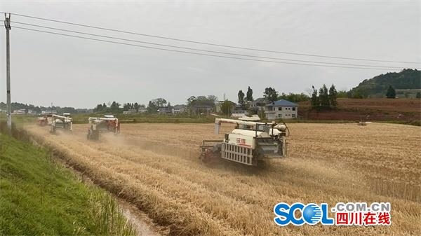 5月12日上午,资阳市雁江区丹山镇楠木村、两河村,8台大型收割机驰骋在金色的麦浪中。伴随着机器的轰鸣声,一颗颗饱满的麦粒从收割机仓门倾泻而下,随后被送进拉粮车。