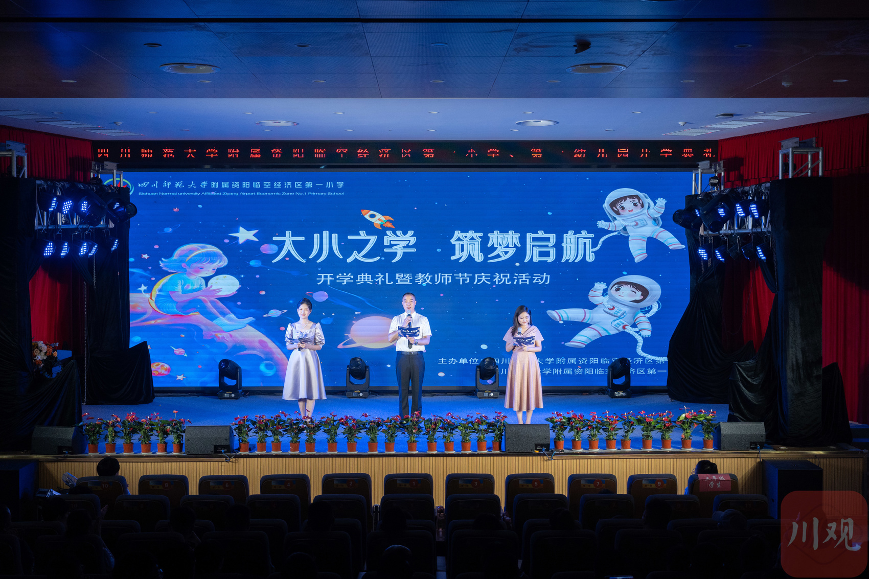 活动现场,四川师范大学附属实验学校、四川师范大学附属资阳临空经济区第一小学、第一幼儿园以及四川音乐学院民乐系等学校的师生们分别上台,表演了精彩的舞蹈《傩乐》、朗诵《杏坛雁歌》、古筝合奏《沧海神话》等节目,活力四射的表演营造了浓厚的开学氛围。