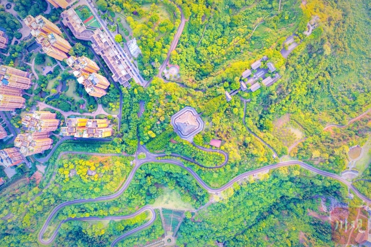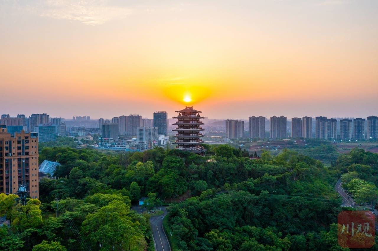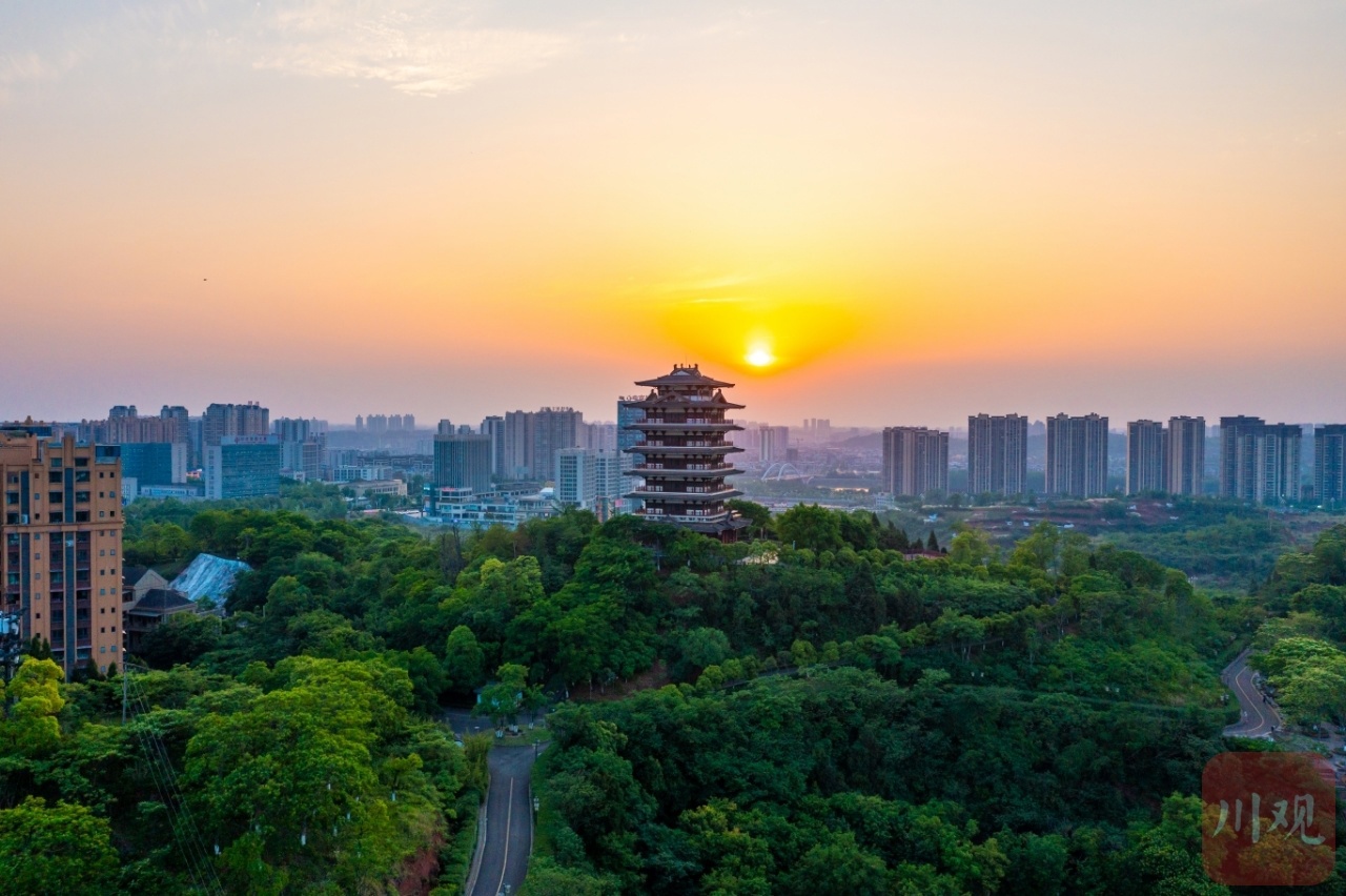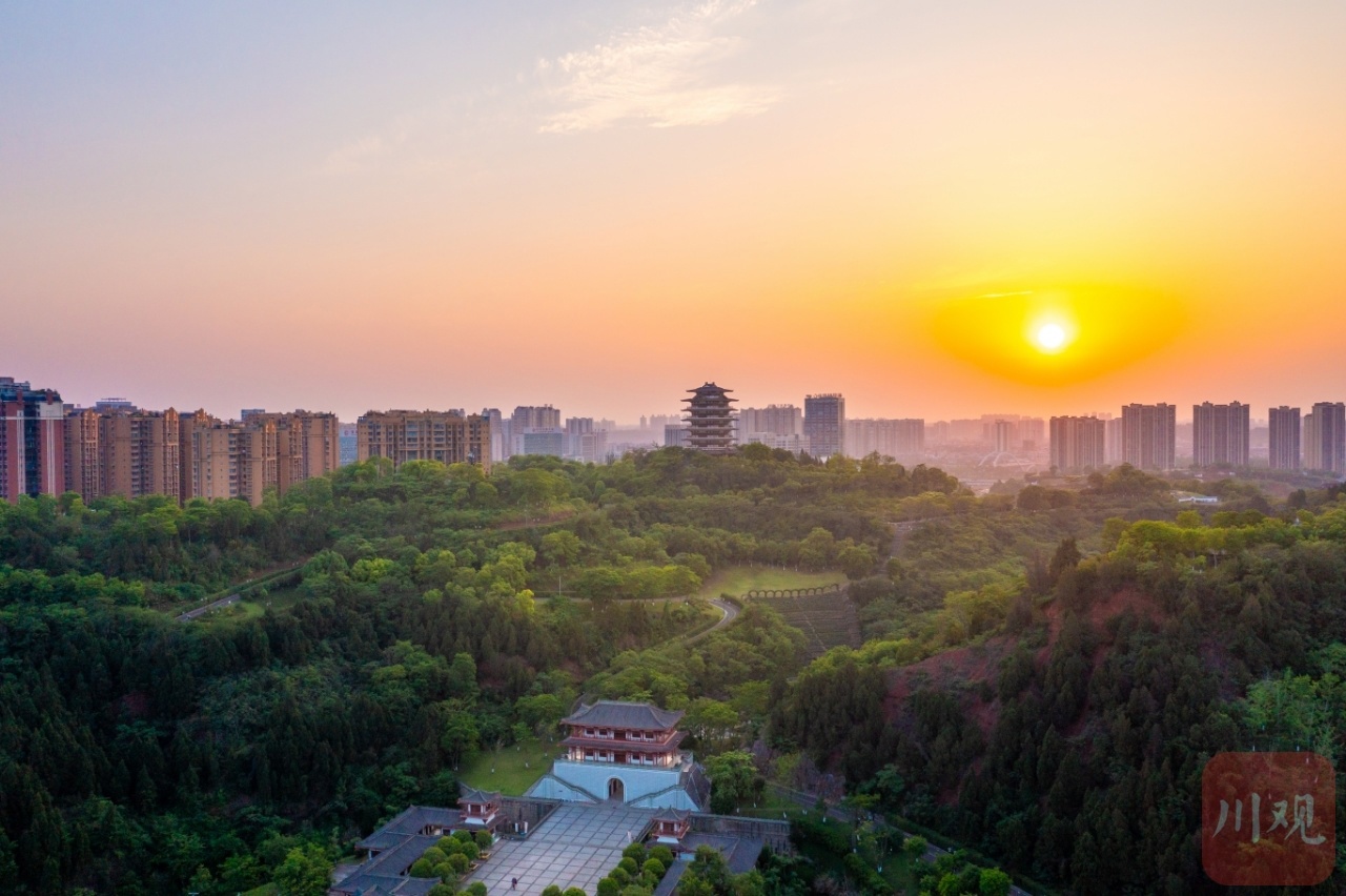 近日,资阳市雁江区字库山公园沐浴在夕阳余晖下,高空俯瞰下的公园草木葱郁,景色优美。