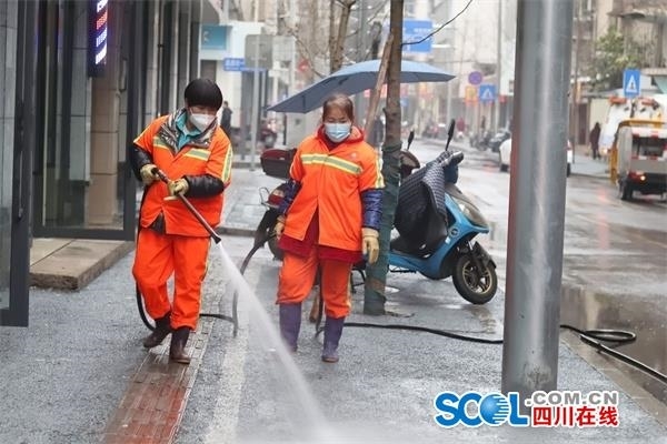 四川在线资阳频道消息(杨蜀丹 实习生 张桥)1月21日上午,资阳市河心地老旧小区改造后的背街小巷内,一辆清扫车缓缓行驶,环卫工作人员手拿高压水枪,将路面及人行道尘土冲刷至道路两旁,几名拿着扫帚和推刷的环卫工人紧随其后,将路面清扫得干干净净。