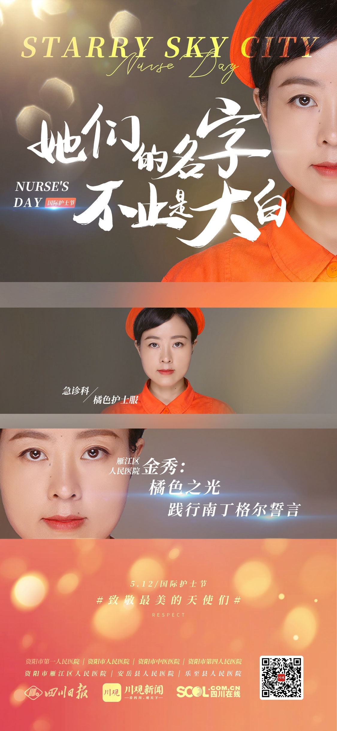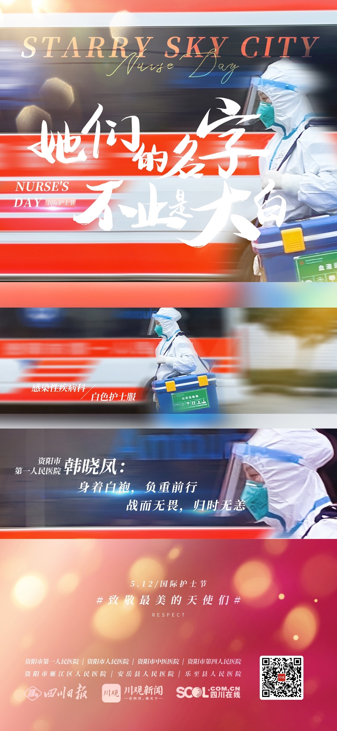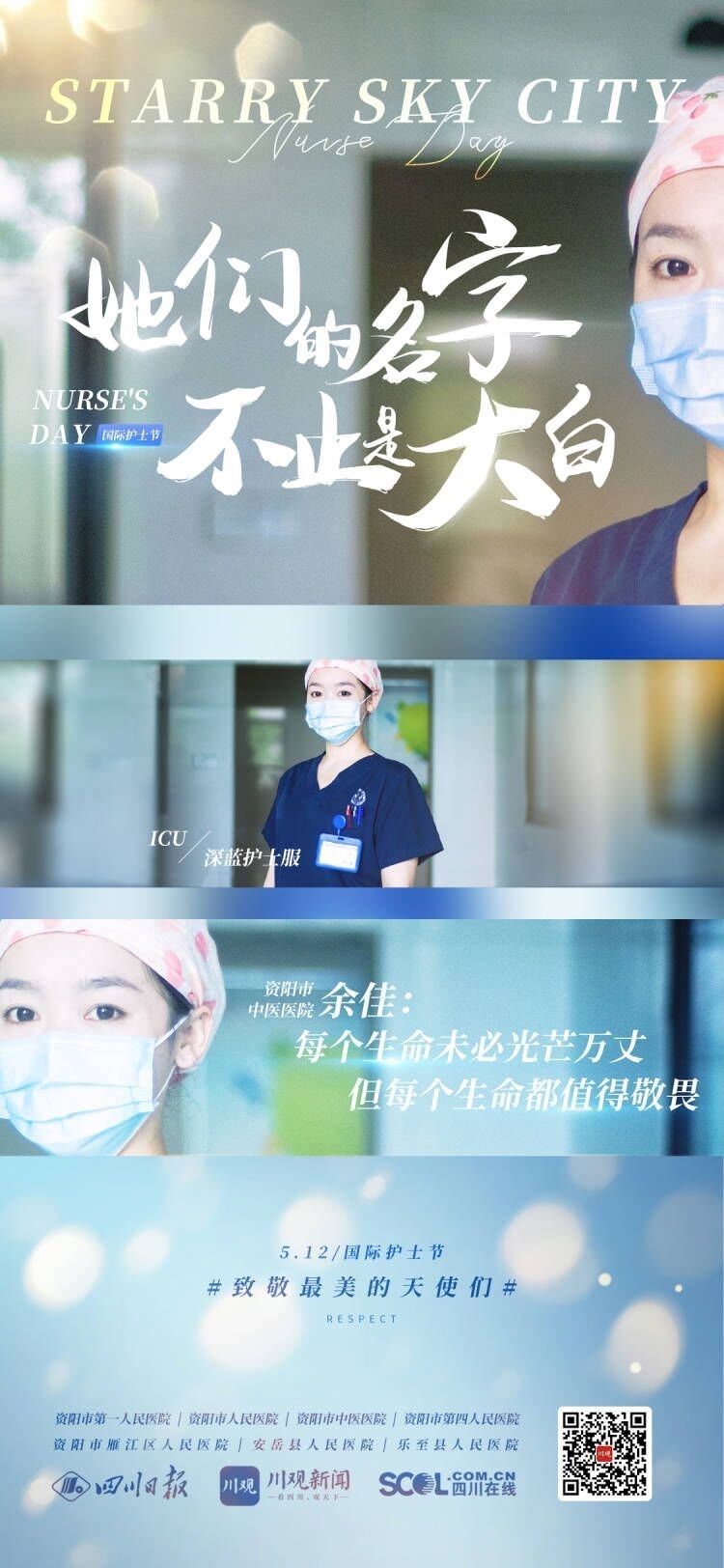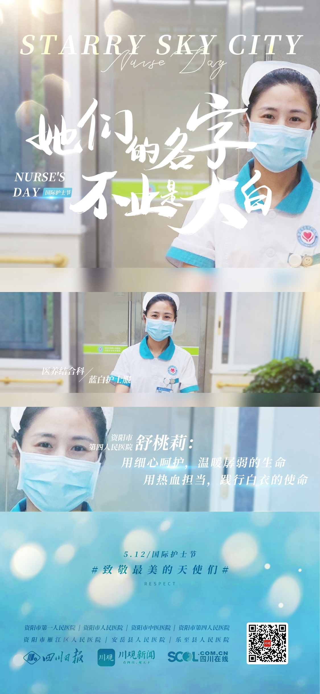 今年的“5·12”护士节来临,四川日报资阳全媒体中心联合资阳市卫生健康委员会以及资阳市第一人民医院、雁江区人民医院、安岳县人民医院和乐至县人民医院等医疗机构,共同推出《他们的名字不止是大白》系列策划,走进这群日夜坚守在医院各个岗位,守护人民安康的护理人员,感受他们的心中有爱、身上有光。