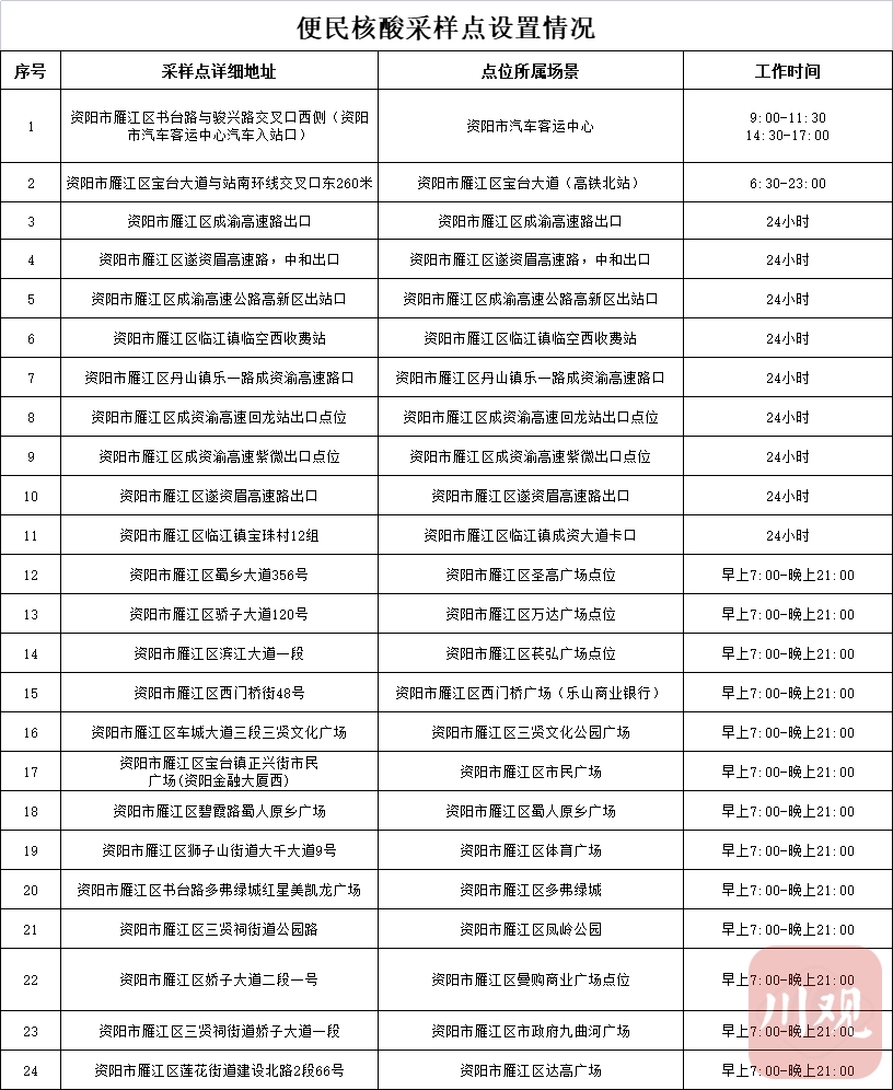 四川在线资阳频道(杨蜀丹)7月19日,记者从雁江区卫健局了解到,为满足广大群众“愿检尽检,应检尽检”意愿,及时排查潜在风险,保障全区人民群众生命安全和身体健康,自19日起,雁江47个便民核酸检测点将实行免费核酸检测。