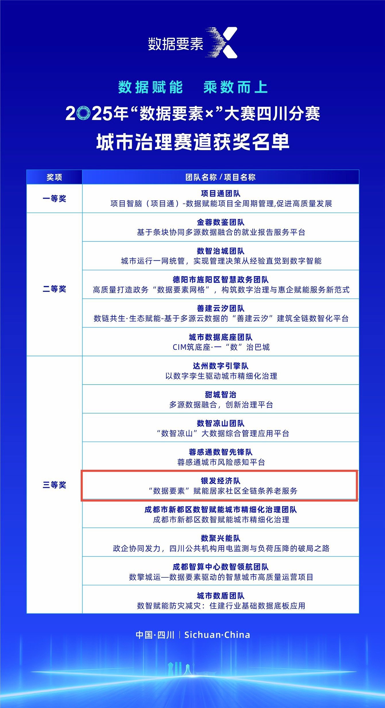 9月25日,2025年“数据要素×”大赛四川分赛总决赛结果公布。记者从现场获悉,由资阳市民政局牵头组建的“银发经济队”参赛的“数据要素”赋能居家社区全链条养老服务项目,获得城市治理赛道三等奖。