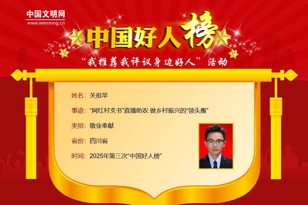 今日,2025年第三次“中国好人榜”正式发布,四川省资阳市安岳县通贤镇帽石村党支部书记、村委会主任关祖苹入选敬业奉献类“中国好人”。