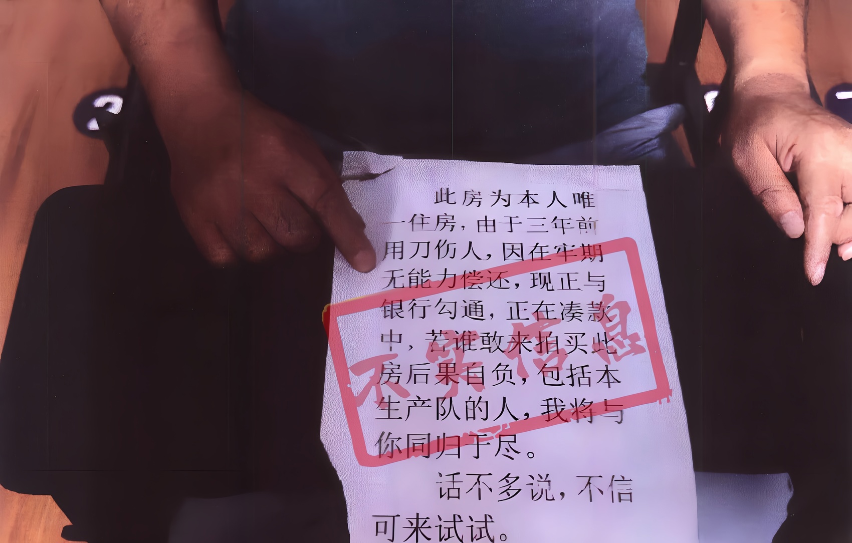 拍卖公告发布不久,房主李先生便在门上发现一张落款“原房主”的恐吓纸条,上面写着:“此房为本人唯一住房。三年前因用刀伤人坐牢,无力还贷。谁敢买此房后果自负,我将与你同归于尽,话不多说,不信可来试试!”起初,李先生并未理睬,以为只是恶作剧。但几天后,同样内容的纸条再次出现。房门锁孔和门缝还被人灌入强力胶水,导致门锁损坏,无法正常使用。