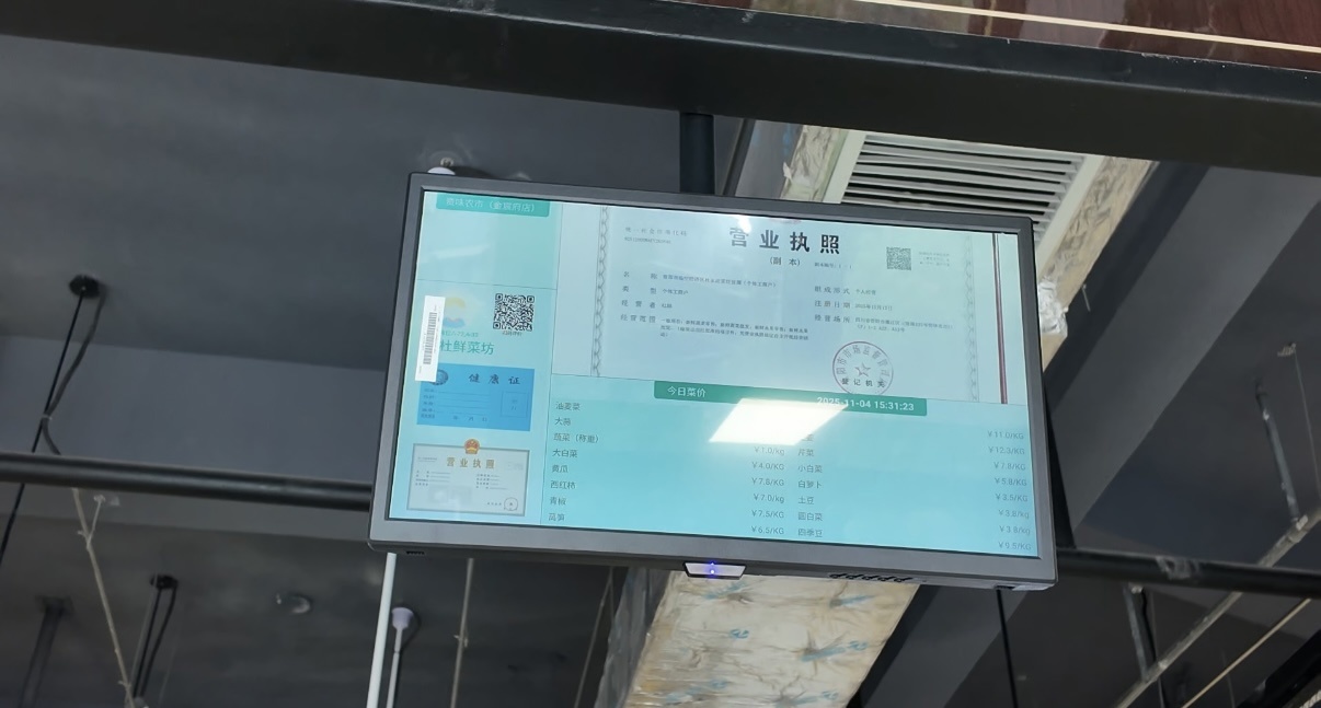 每个摊位前的显示屏也藏着“智慧”。各个摊位屏幕上清晰展示商户营业执照、从业人员健康证等资质信息,还动态滚动所售商品的当日指导价。价格数据由资阳市发改委提供,参考周边农贸市场平均水平制定,为买卖双方搭建起公平交易的价格基准。
