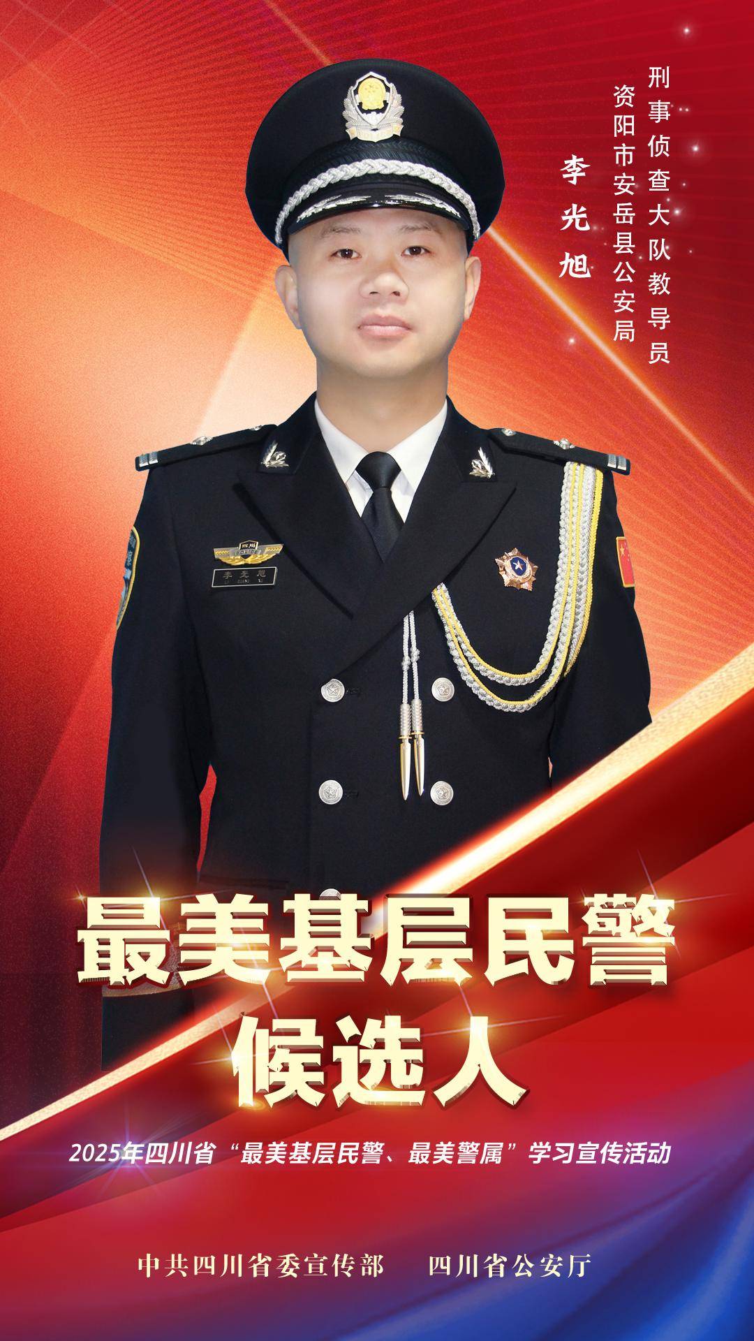 近日,安岳县公安局刑事侦查大队教导员李光旭被推荐为2025年四川省“最美基层民警、最美警属”学习宣传活动的“最美基层民警”候选人。