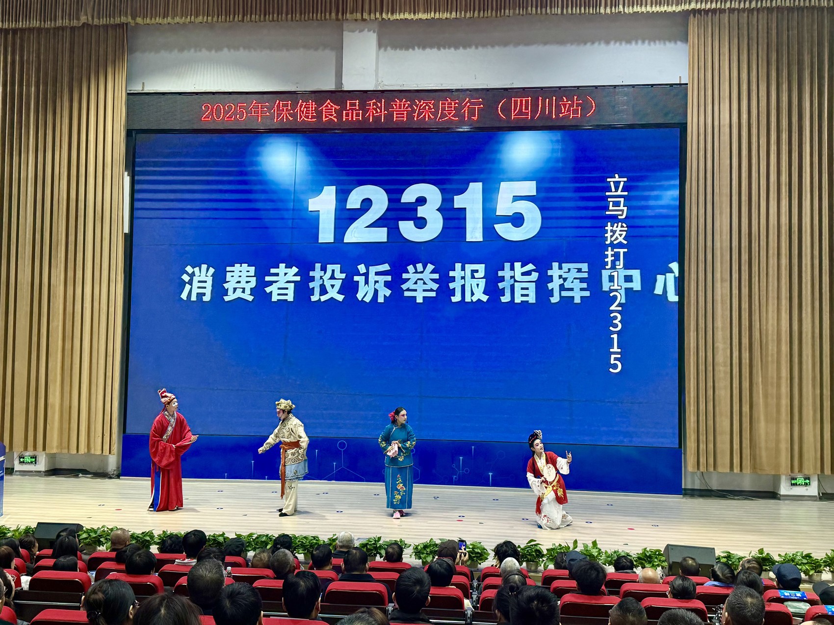 “保健食品非灵丹,记心间!免费讲座送鸡蛋,神药吹成是‘仙丹’,几万买堆面坨坨,着得惨!”现场,川韵三句半《科普识“诈”护安康》用诙谐押韵的方言,把保健食品的虚假宣传等内容转化为朗朗上口的唱词,将保健食品虚假宣传的套路娓娓道来。而情景剧《大爷深陷“保健”坑,监管出手破骗局》则通过鲜活表演,层层揭露“免费陷阱”“亲情营销”等常见套路,引导公众科学消费、防范骗局。