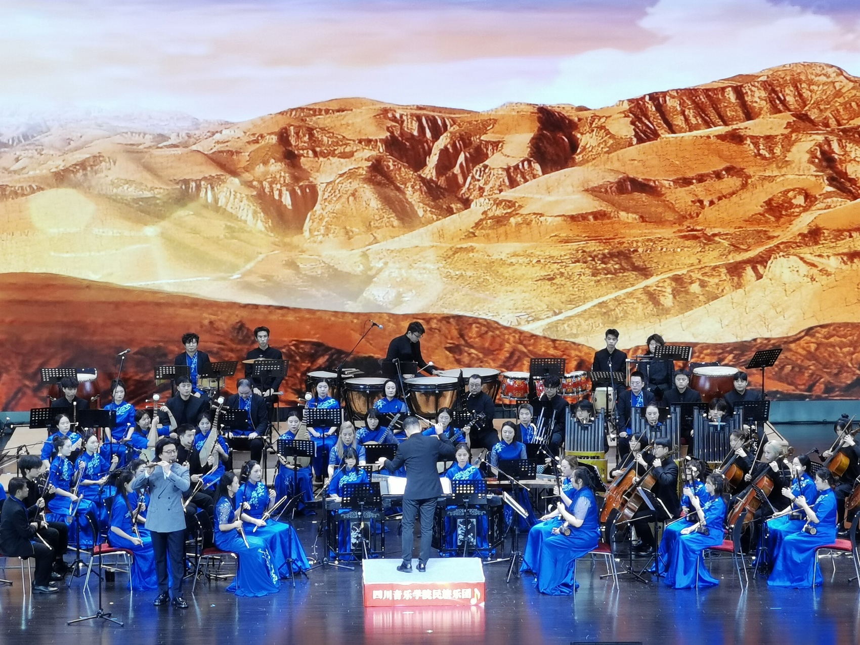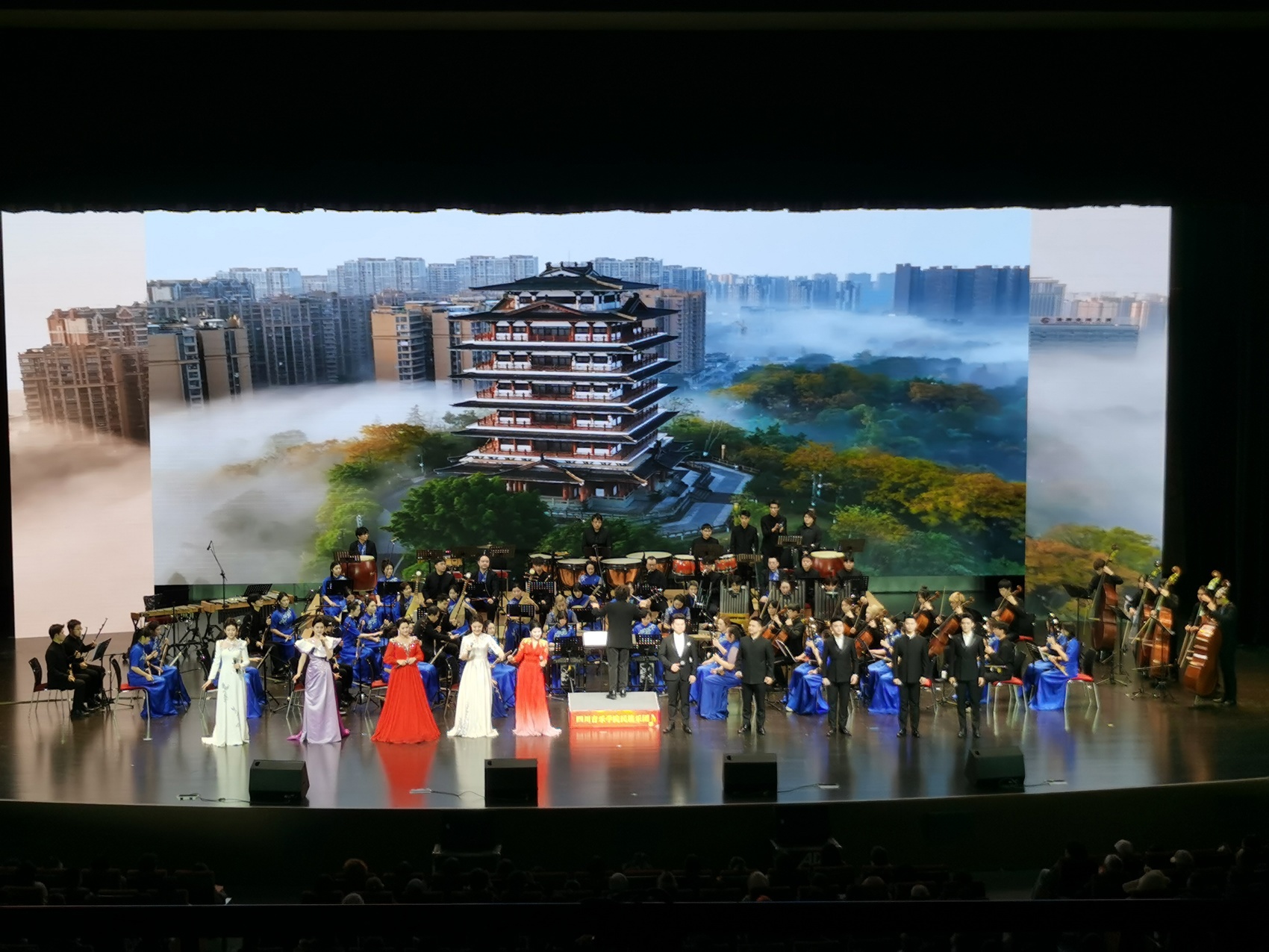音乐会由四川音乐学院民族乐团倾情演奏。与以往不同的是,本届音乐会突破传统纯演奏模式,创新采用“关键词引领+情景化串联”的沉浸式叙事,以“传承”“繁荣”“幸福”“使命”四大篇章,带领观众完成了一次从深厚历史走向璀璨未来的“资阳之旅”——舞台化身时空长廊,陈毅元帅的红色诗篇《梅岭三章》在男声独唱中激昂回响,安岳石刻的千年风韵、轨道交通资阳线的时代脉动、中国牙谷的产业名片以及沱江水畔的灵动风光,均以艺术化、场景式的形式巧妙融入各个乐章,让观众在音符流淌间,全方位感知资阳的独特魅力与蓬勃生机。
