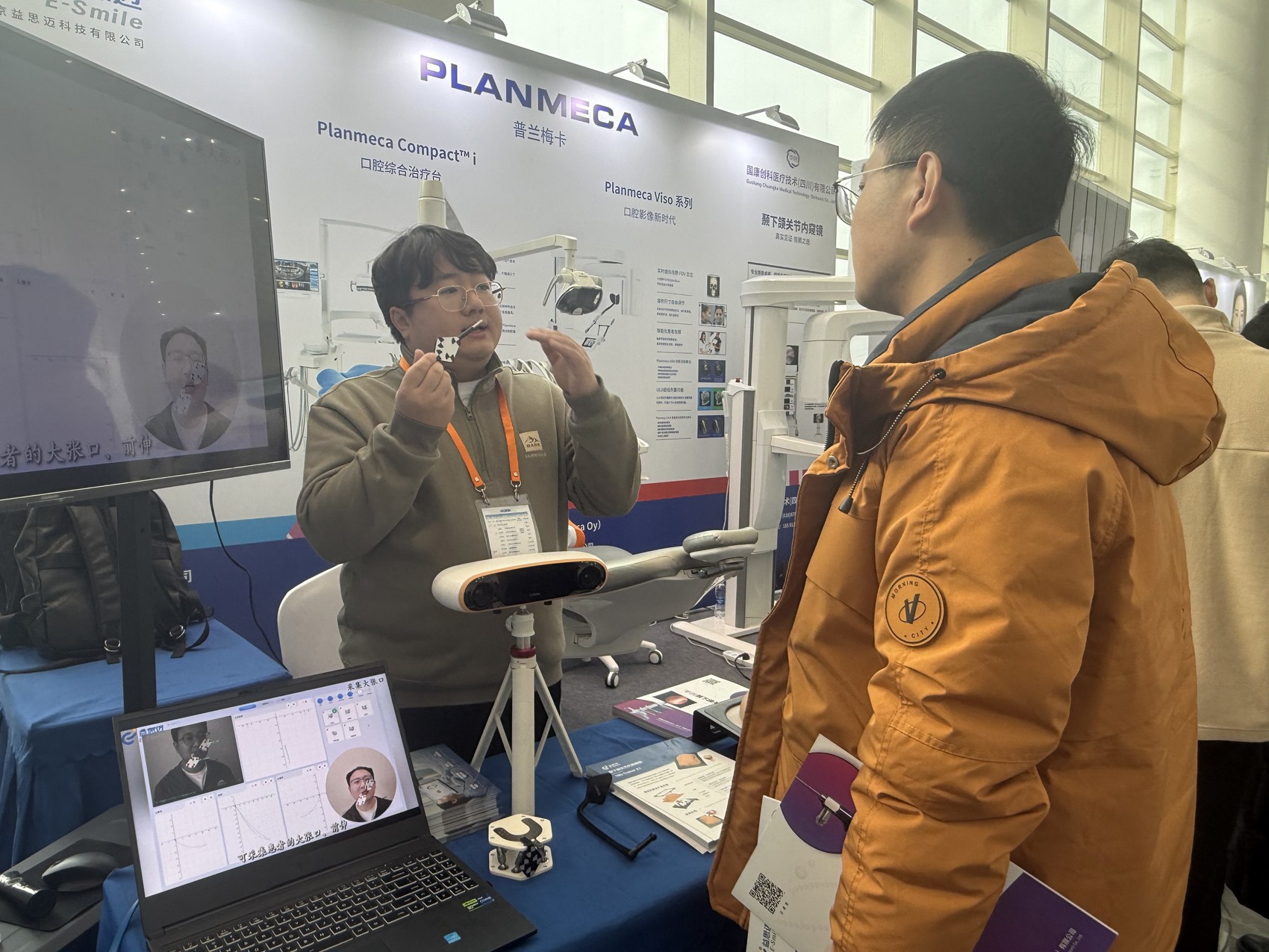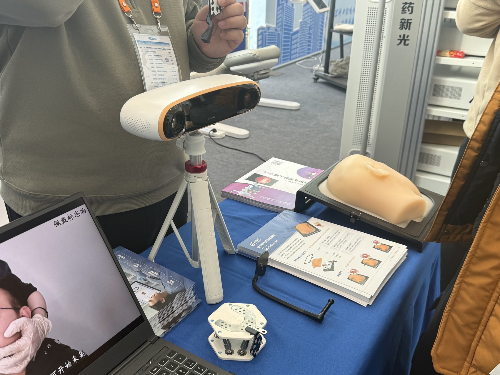 “你这款产品,有些什么功能?”“系统能够三维数字化记录下颌运动轨迹,佩戴采集标志物后,最快5分钟系统便能采集完所有数据。”“我们先加个微信,后续有需要就找你订购”……此次展台的亮点产品之一,是北京益思迈科技有限公司带来“下颚运动分析仪”(电子面弓),仪器能够进行下颌运动分析,相比于业内其他产品,系统采集效率高、精度高,前来咨询的人络绎不绝。