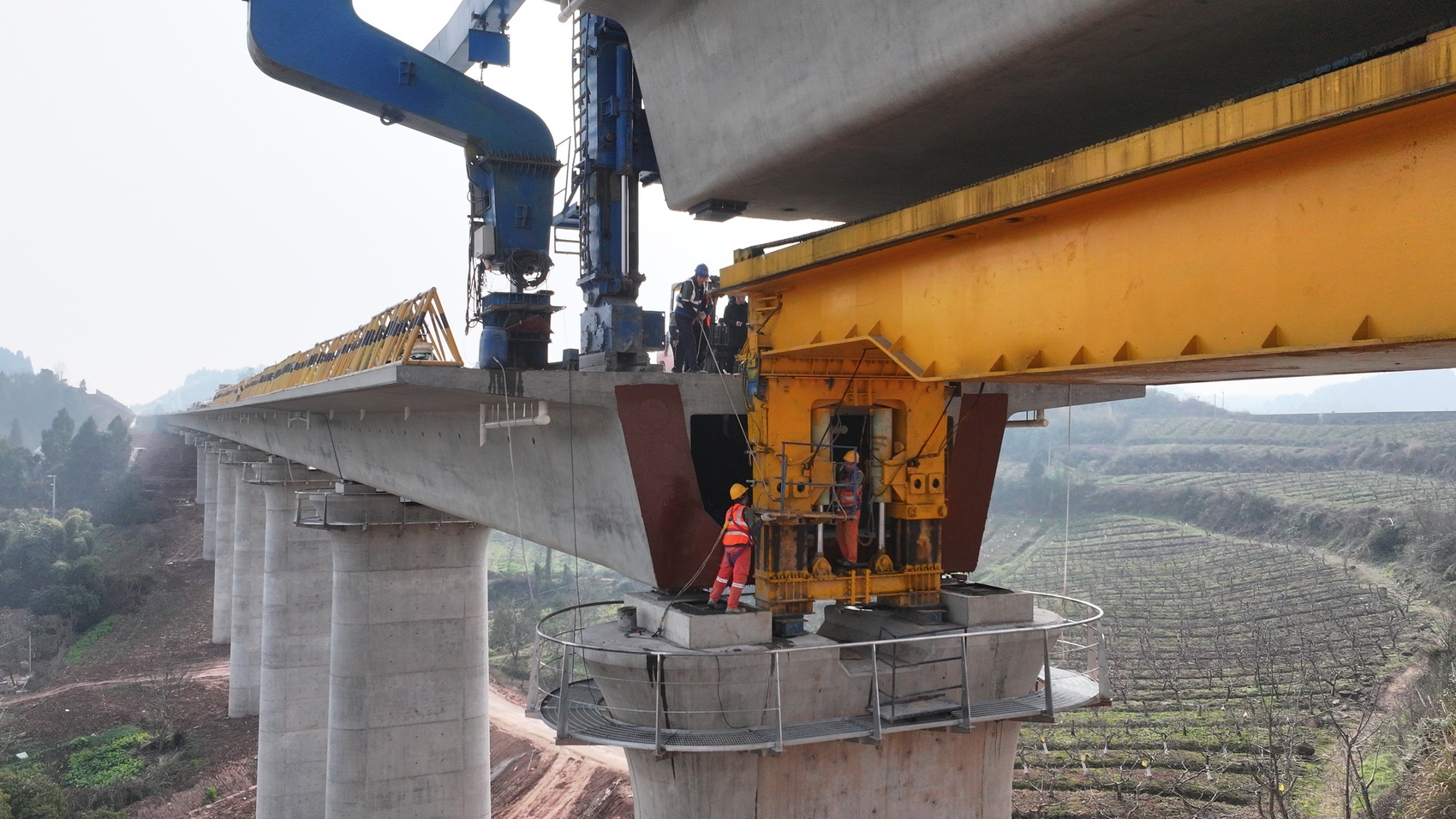中午十二点,竹仙村一号大桥施工现场,巨型架桥机缓缓移动,将长31.5米、宽12.6米、重约697吨的箱梁吊装至桥墩。负责竹仙村一号大桥箱梁施工的成渝中线6标乐至制梁场,承担着全线最重的箱梁架设任务,涵盖桥梁25座、桥面总长35.886公里,需完成箱梁预制架设719榀。