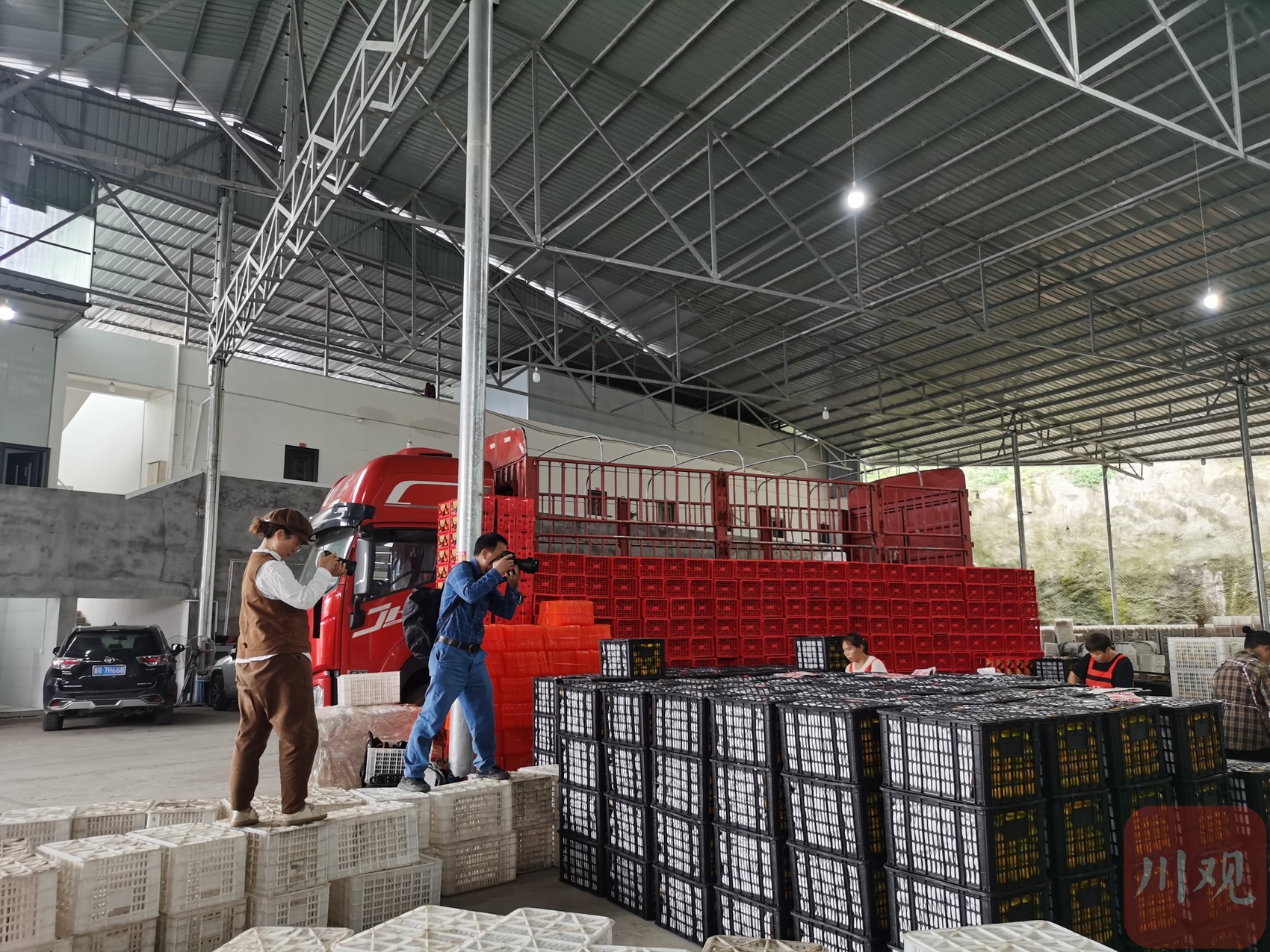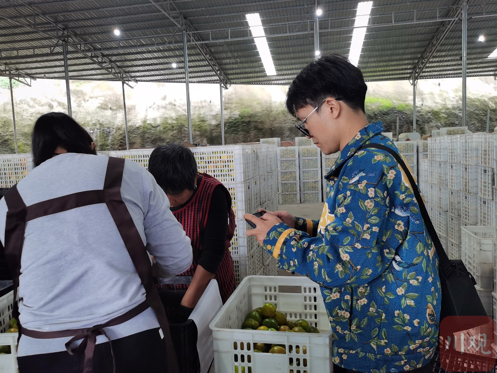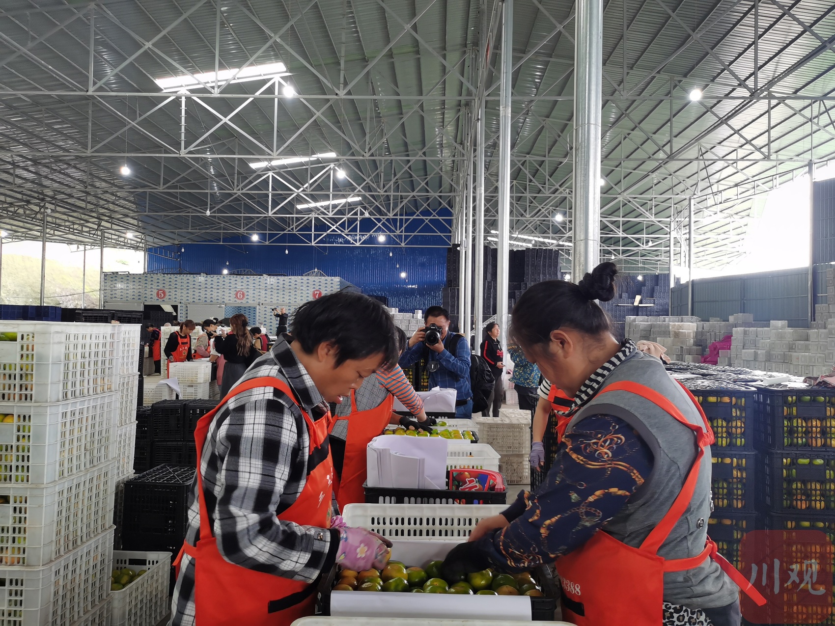 “妹儿,快来吃橘子!”在丰裕镇敲钟村11社,采风团一行来到蜜柑分拣现场,村民就热情地招呼道。一辆大卡车停在空地处,一旁的村民们按照分拣、装箱、过称、上车的流程分工协作,在他们身后是一片茂密的柑橘林,负责采摘和运输的村民正在地里忙碌着。