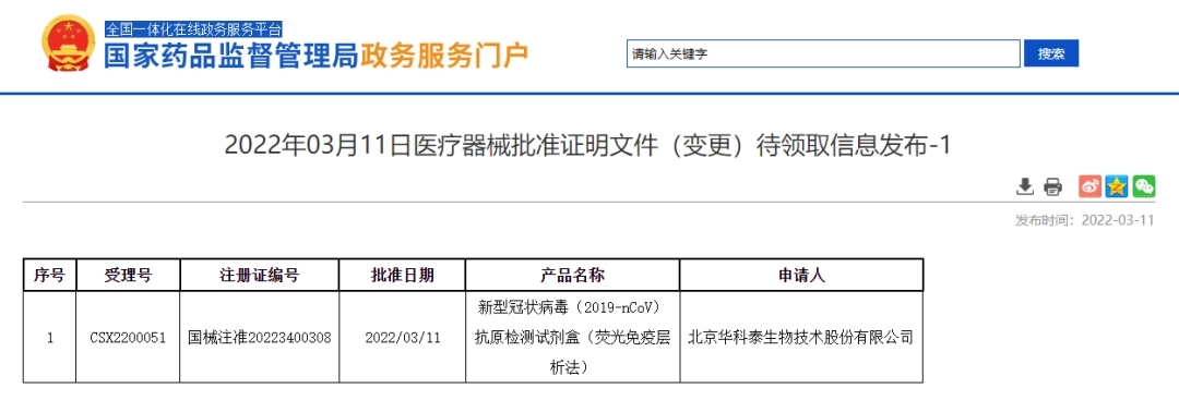 3月12日,国家药监局发布通告,批准南京诺唯赞、北京金沃夫、深圳华大因源、广州万孚生物、北京华科泰生物的新冠抗原产品自测应用申请变更。
