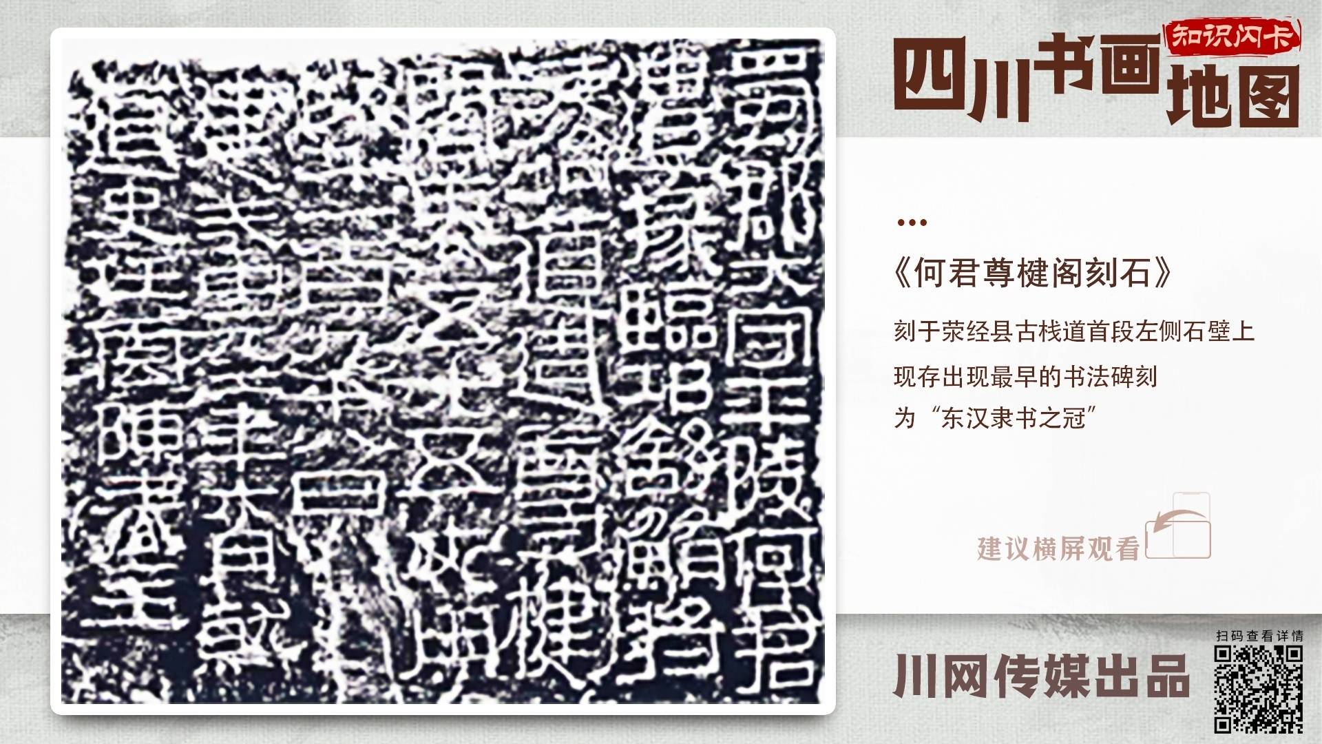 《何君尊楗阁刻石》刻于公元57年,是现存出现最早的书法碑刻,其刻石时间超过之前认为最早的汉中《鄐君碑》(汉永平九年落成,即66年),为“东汉隶书之冠”。宋洪适说此碑为:“东汉隶书,斯为之首”,并论及书法:“字法方劲,古意有余,如瞻冠章,甫而衣缝掖者,使人起敬不暇”。翻译成现代的语言,大概是:东汉的隶书,《何君阁道碑》算是开头的。字形方正遒劲,古雅的韵味最为醇厚。好比我们看见那戴着殷商时代的黑布礼帽,身着儒士宽袍大袖礼服的人,令人肃然起敬不已。学写这字呀,即使写秃的笔堆成一座坟,也不见得就沾了它的边。
