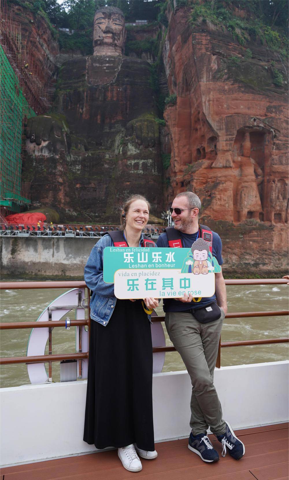外国游客在四川乐山乘船游览乐山大佛(6月7日摄)。新华社记者 张超群 摄