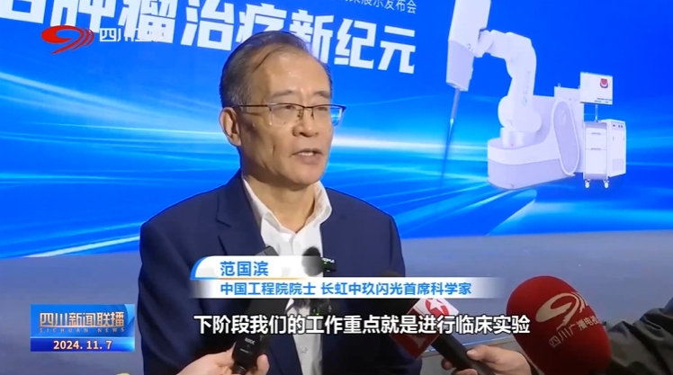 中国工程院院士、长虹中玖闪光首席科学家 范国滨:下阶段我们的工作重点就是进行临床实验,通过几期临床实验能够获取大量的实验的数据,我想这个对于未来制定癌症病人的治疗方案是非常重要的,对于癌症患者应该说是带来一个非常好的福音。